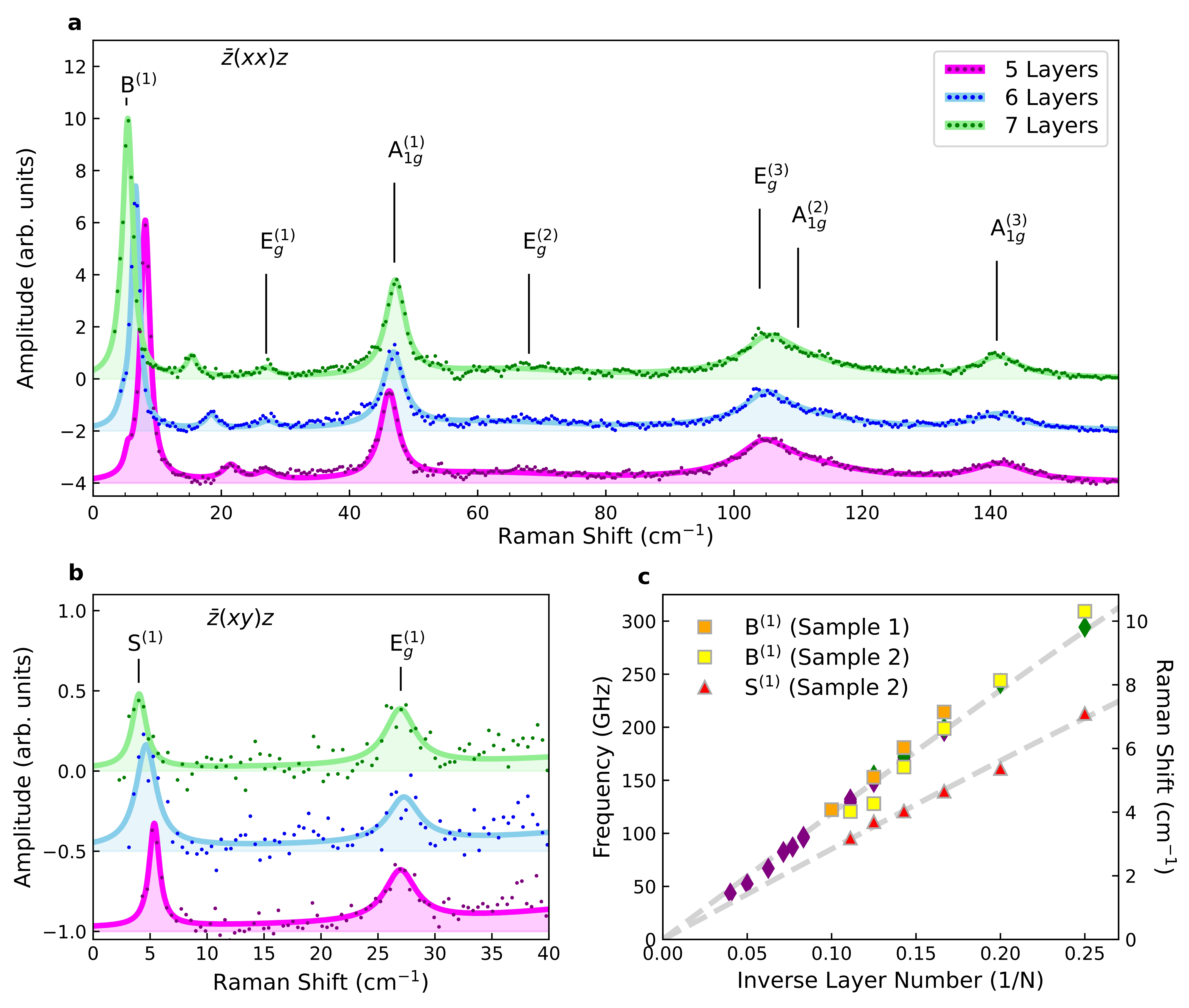 图2.不同层数MnBi2Te4的超低波数偏振拉曼光谱。(a)在平行偏振配置中,数据包含 6 个与先前报道拉曼数据相匹配的层内声子振动的高频峰,以及一个与层间呼吸模式声子对应的低频峰,标记为 B(1)。瑞利散射背景已经被减去。(b)在交叉偏振配置中,呼吸模式消失了,观察到了对应于剪切模式的峰,标记为 S(1)。(c)将 B(1)与 S(1)峰的频率以及超快光谱数据(样品1和2分别为紫色和绿色菱形符号)绘制为厚度的函数。数据间具有良好的一致性,并且与线性链模型符合得很好。