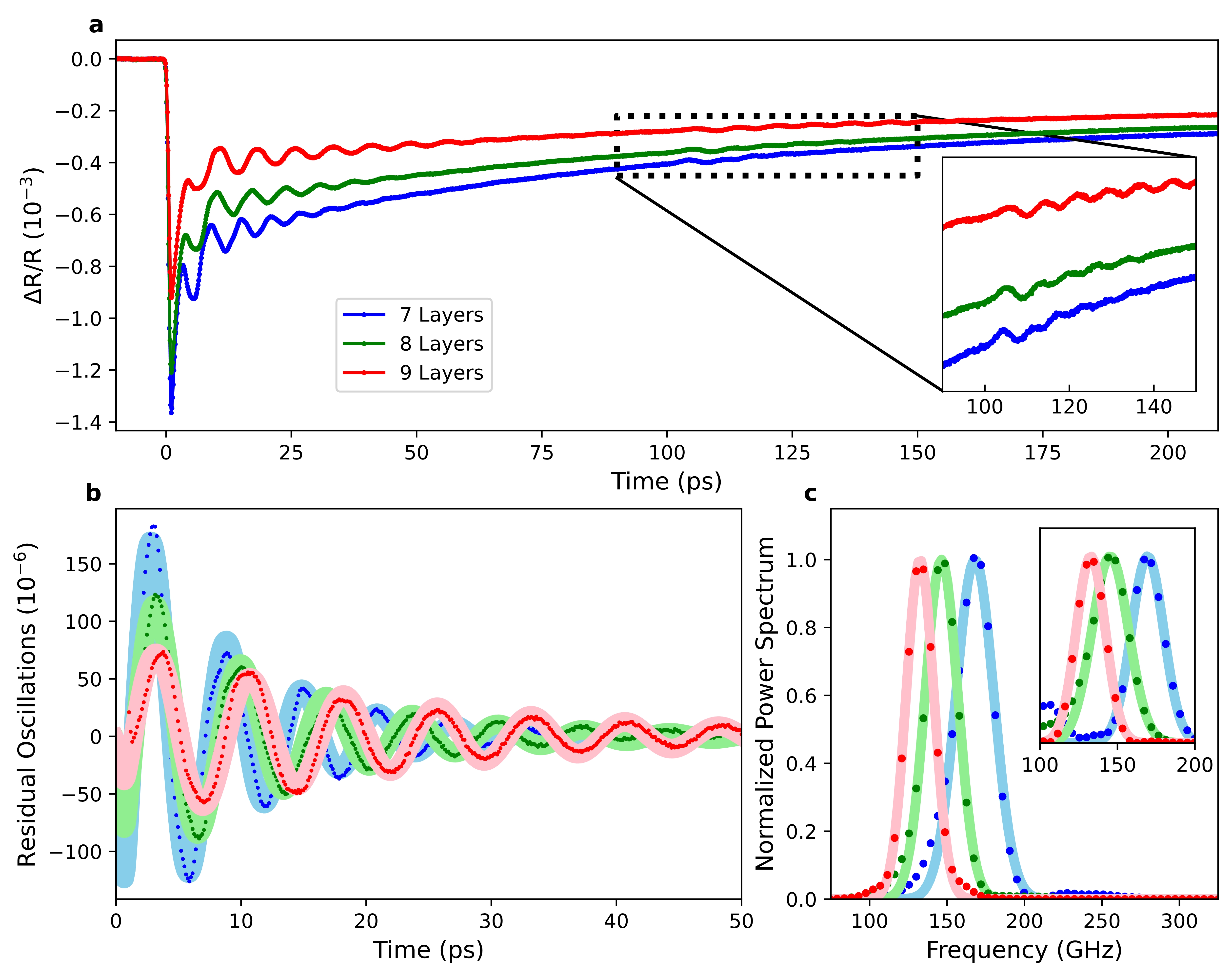 图1. 不同层数MnBi2Te4材料的时间分辨反射率光谱测量数据。(a)三个不同层数区域的原始数据显示信号存在三个时间演化过程:非常短暂的尖峰、指数衰减和声子振荡。插图突出了在泵浦脉冲后约100 ps发生的振荡回波。(b)减去前两个分量可以更清晰地看到声子振荡,实线为指数衰减正弦曲线拟合。(c)快速傅立叶变换(FFT)后的数据,突显了不同厚度之间频率的显著变化,其中插图显示了约100 ps处回波的FFT,它们具有相同的层数依赖性。