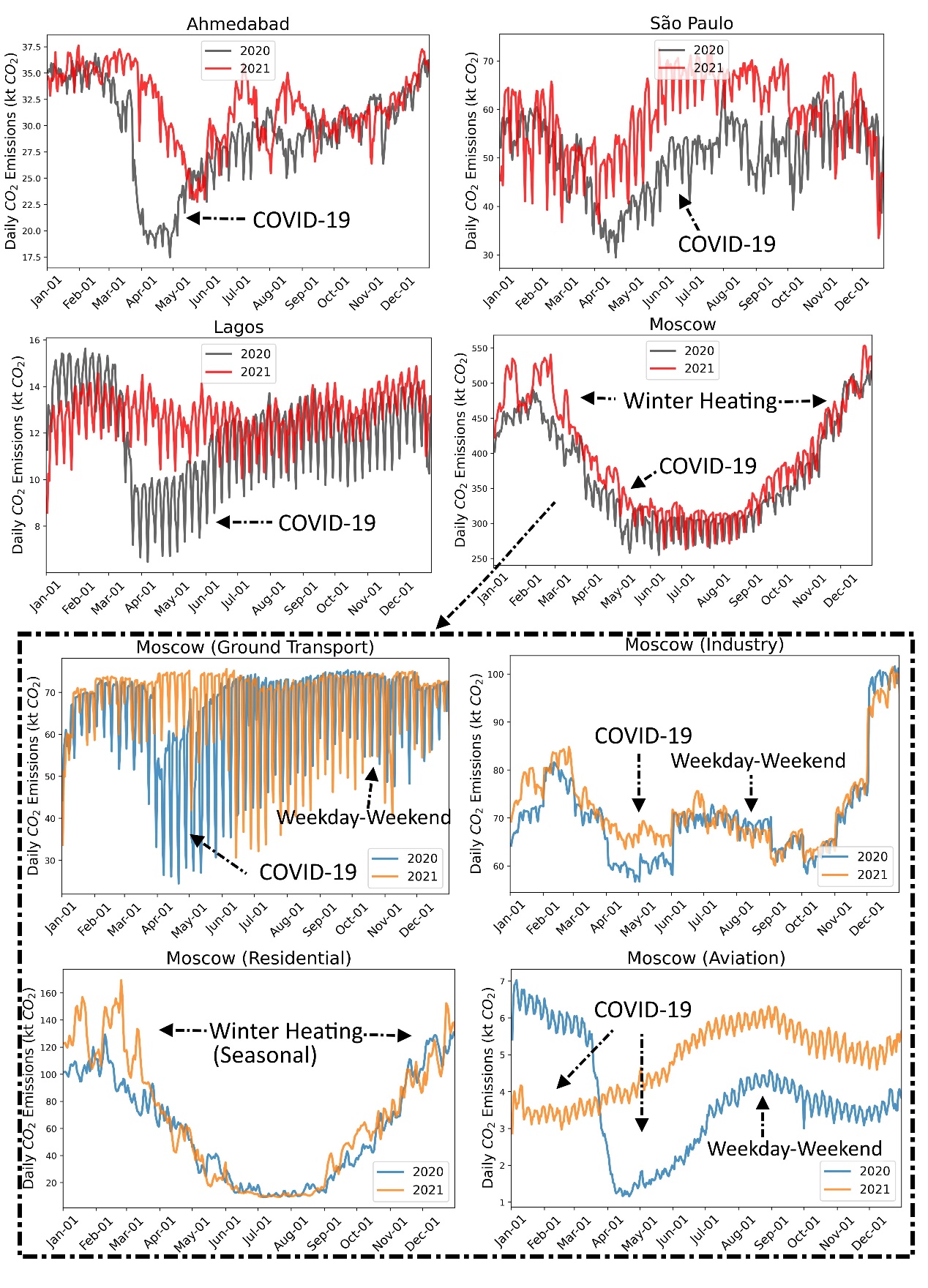 图3.Carbon Monitor Cities反映突发事件如新冠疫情对不同城市的影响