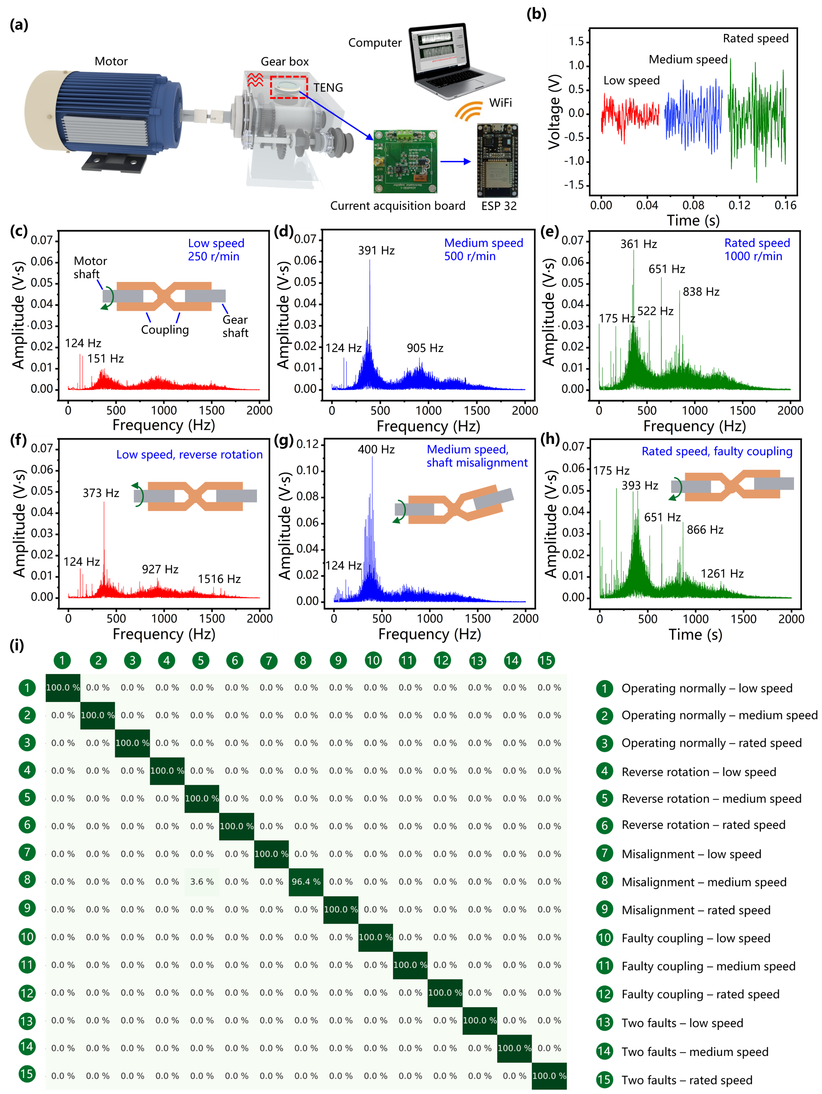 近日,beat365中文官方网站深圳国际研究生院丁文伯助理教授的智能感知与机器人(Smart Sensing and Robotics, SSR)课题组开发了一种基于摩擦纳米发电机(TENG)的高灵敏度自驱动振动传感器。利用柔性介电薄膜与多孔金属材料构建摩擦层,有效提升了TENG传感精度,所制备的TENG传感器可以检测到1-2000 Hz频率的振动,即使在高温高湿的环境中,TENG传感器输出的信号在波形上不失真(幅值改变)。在实验室条件下将TENG传感器初步应用于机械齿轮系统的运行状态检测,将机器学习与TENG信号识别相结合,达到了高准度识别机械系统运行状态的目的,检测结果可实时显示在远程监控或者移动设备上。TENG传感器同时可用于空气压缩机、热风枪、砖瓦空鼓等方面的振动检测,并通过嵌入式系统将运行状态在屏幕显示。该工作为构建TENG自驱动传感器提供了新思路,在机械故障智能诊断方向具有应用潜力。