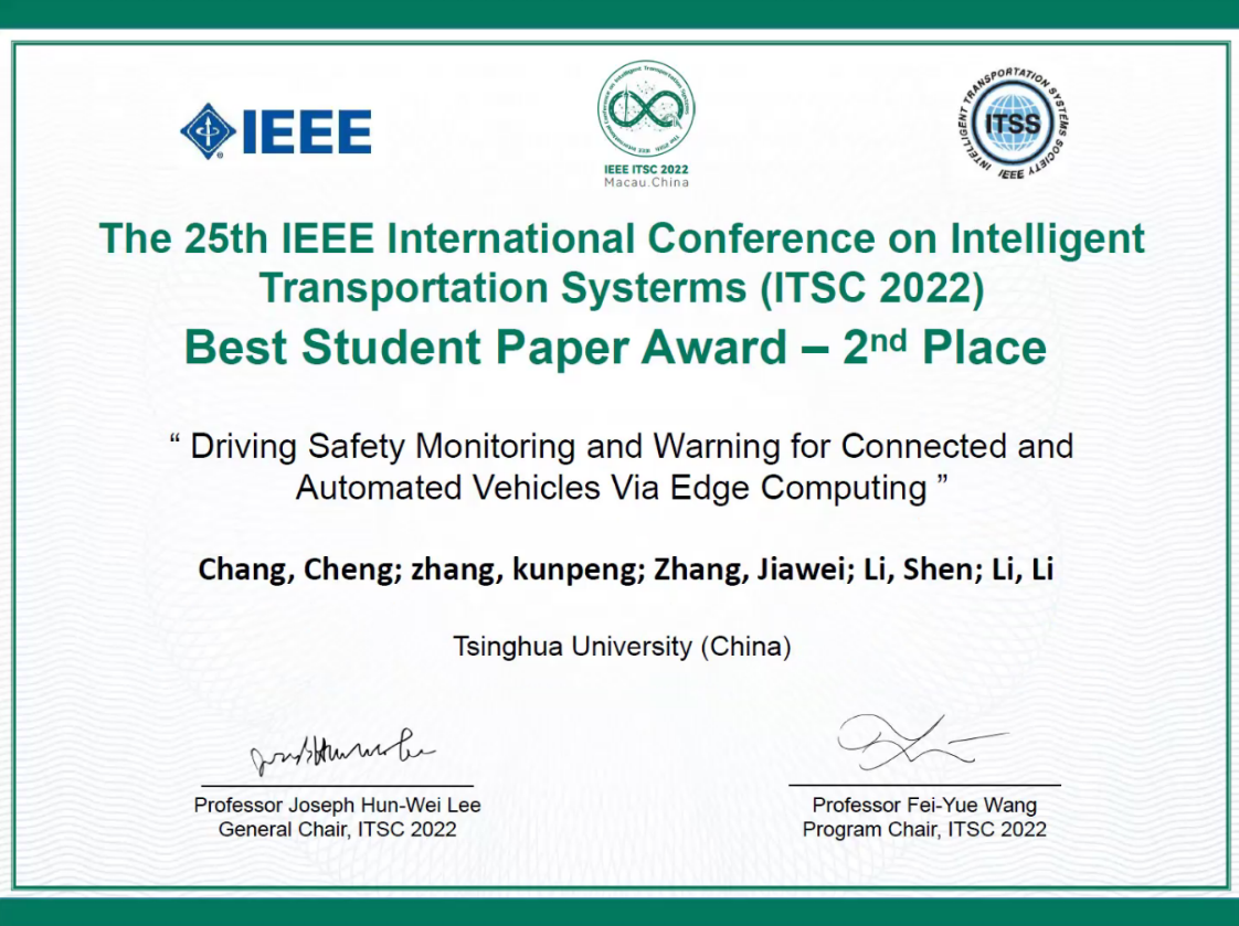 清华新闻网10月14日电 近日,第25届IEEE智能交通系统国际会议(IEEE International Conference on Intelligent Transportation Systems,ITSC)于中国澳门召开。ITSC是智能汽车与智能交通领域的国际顶级学术会议,此次会议收到全世界45个国家和地区的近1300篇投稿。大会评选了共3篇最佳学生论文奖(Best Student Paper Award),beat365中文官方网站自动化系2021级博士生常成同学的论文《基于边缘计算的网联自动驾驶车辆的驾驶安全监控》(“Driving Safety Monitoring for Connected and Automated Vehicles via Edge Computing”)成功入选。