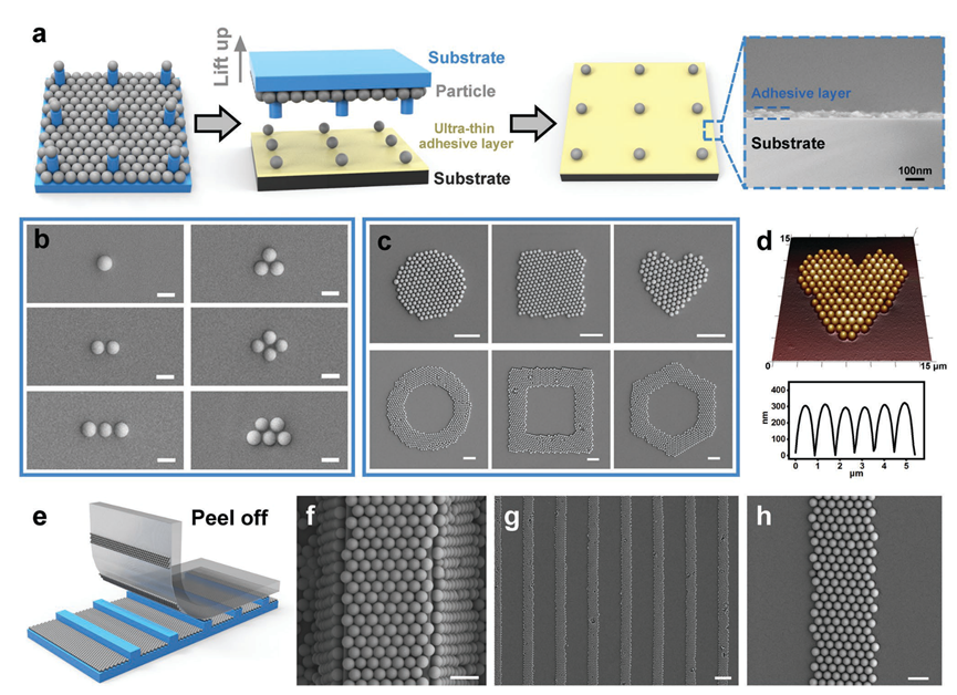 beat365中文官方网站机械系汪家道教授课题组在研究中将张力梯度创新性引入到液气界面自组装中,提出了独特的张力梯度诱导纳米颗粒液气界面快速大面积自组装方法。在该研究中,首先建立了基于表面张力与纳米颗粒表面疏水改性的液气界面纳米颗粒松散悬浮构造方法及设计准则。进一步利用负载表面活性剂的凝胶构建液气界面张力梯度,诱发界面对流,打破纳米颗粒间的静电排斥能量壁垒,快速形成密排有序的大面积胶体晶体自组装结构。实验显示了液气界面横向毛细力能够诱导自组装但同时会损害自组装有序性的“双刃剑”作用,提出并证明了基于张力梯度抑制界面毛细团聚作用和提升液气界面自组装质量的有效性,实现了不同尺寸(从400纳米至8微米)、不同形状(球形、花簇状、核壳结构等)微纳米颗粒自组装薄膜在各种基底表面的可控制备。研究基于张力梯度自组装的灵活可持续构建优势,一定程度上解决了纳米颗粒在曲面上的高质量自组装制造难题。研究实现了超1000cm2自组装结构在几秒时间内的超快制备,制造面积和速度相比传统方法提升两个数量级以上,在一定程度上有效解决了大尺寸自组装结构工业化难题。