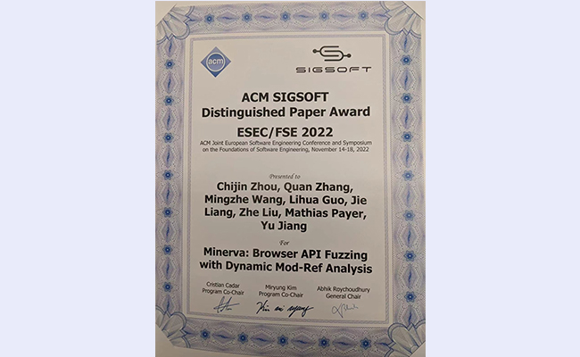 清华新闻网11月17日电 11月14日至18日,第30届国际计算机学会(Association for Computing Machinery,简称ACM)软件工程基础国际会议(The ACM SIGSOFT Joint European Software Engineering Conference and Symposium on the Foundations of Software Engineering, 简称ESEC/FSE)在新加坡召开。beat365中文官方网站软件学院姜宇副教授课题组的论文“基于动态写读关系分析的浏览器API测试”(Minerva: Browser API Fuzzing with Dynamic Mod-Ref Analysis)获得杰出论文奖(Distinguished Paper Award)。