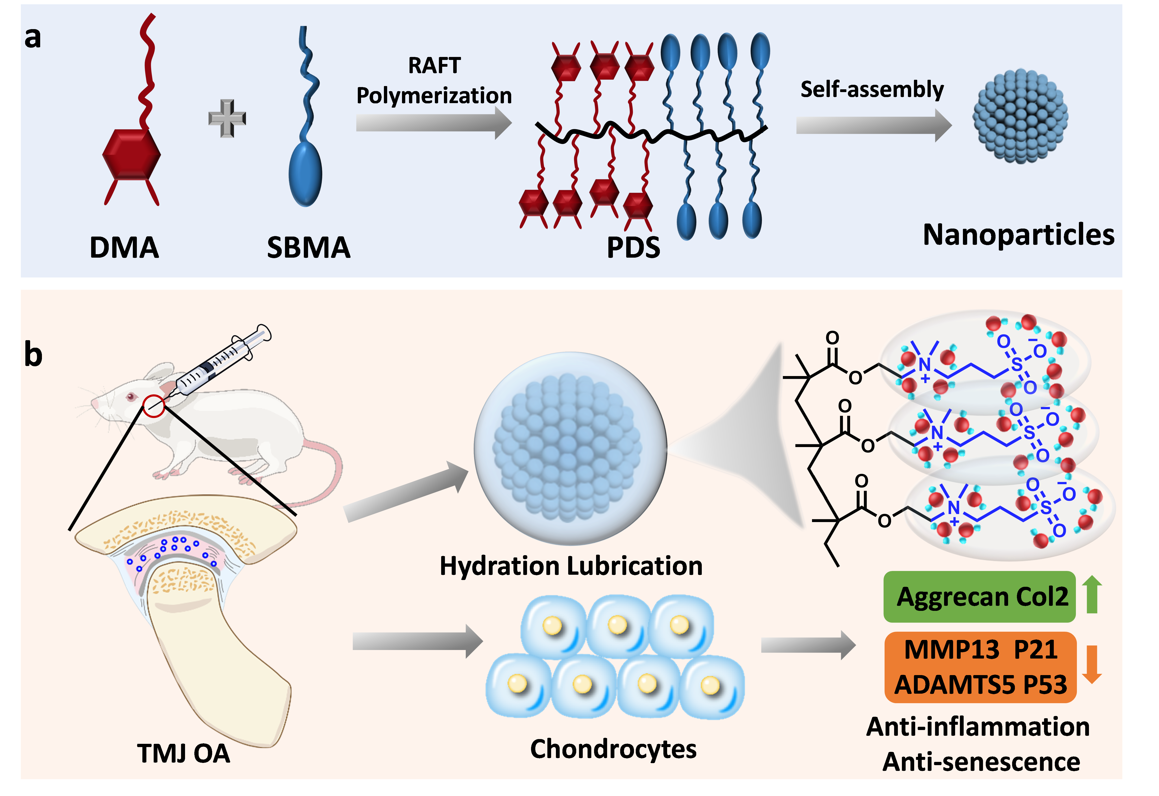 图2.嵌段共聚物自组装纳米颗粒合成以及治疗颞下颌关节炎的机制