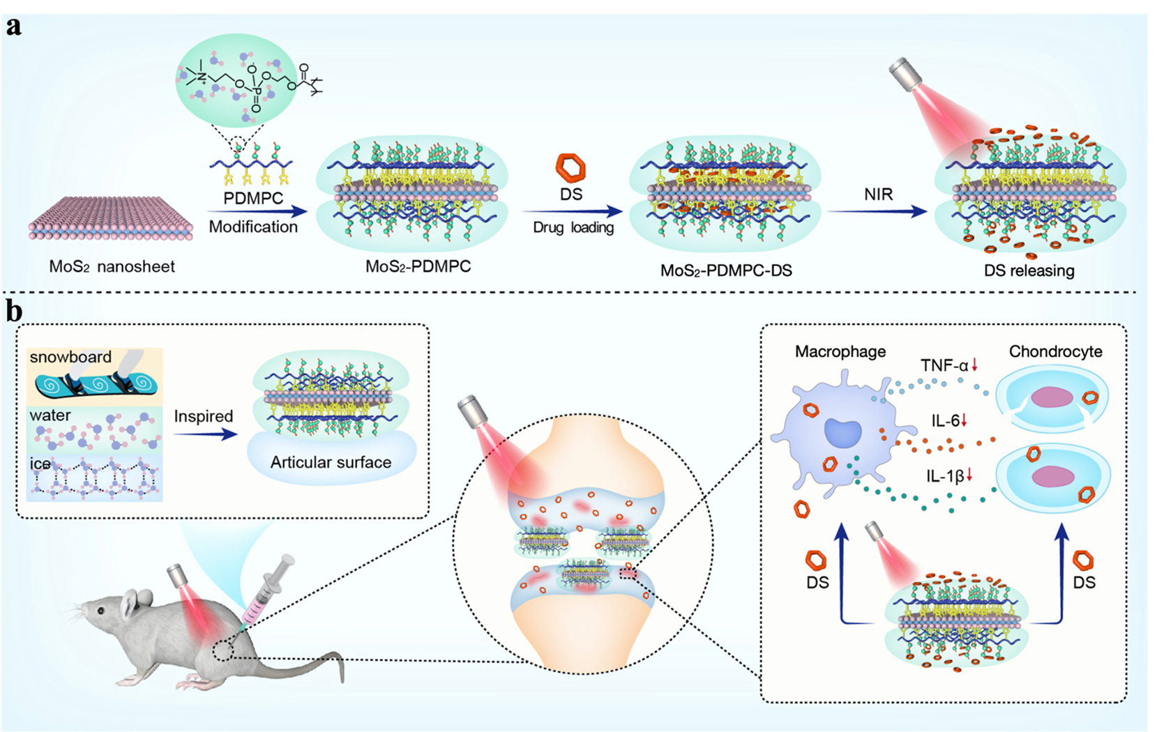 图1.固-液复合润滑纳米材料合成以及治疗膝骨关节炎的机理示意图