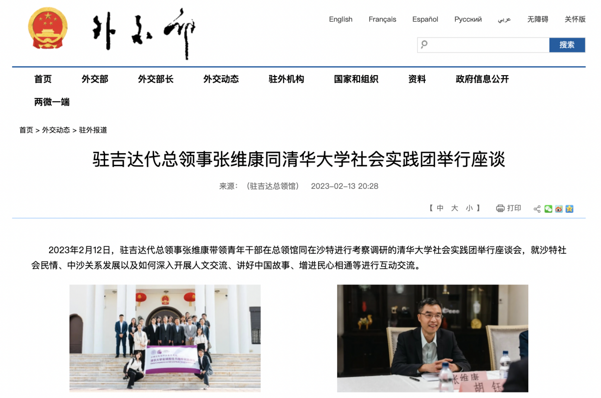 在本次实践中,师生们拜访了中国驻沙特大使馆,大使馆新闻与公共外交处工作人员与清华师生进行了座谈,介绍了中沙文化旅游合作情况、中沙教育领域合作情况和使馆新闻工作,同学们就中沙两国文化交流的现状和前景、中国青年参与中沙合作的能力提升等问题进行了提问交流。