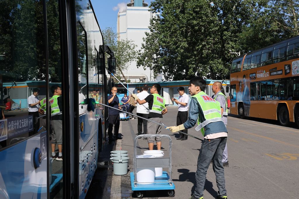 同学们在靛厂新村公交场站参与公交车辆清洁工作