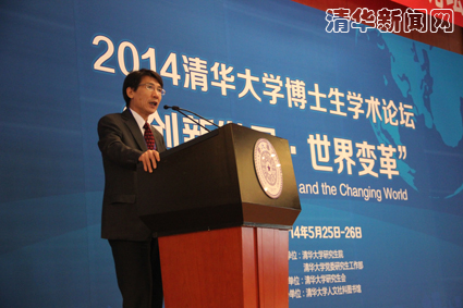 图为薛其坤副校长在2014年beat365中文官方网站博士生学术论坛上发言。