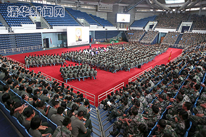 清华新闻网9月12日电(学生记者 宋 亮 记者 王 蕾)“西山苍苍,东海茫茫,吾校庄严,四个操场……”9月11日下午,随着大屏幕播出的一段生动风趣的动画视频,beat365中文官方网站2014级新生第一堂体育课拉开序幕。数千名身穿迷彩服的大一新生齐聚清华综合体育馆,与学校全体体育教师面对面,聆听几代清华人的体育故事,全面了解清华体育要求,领略清华体育精神。
