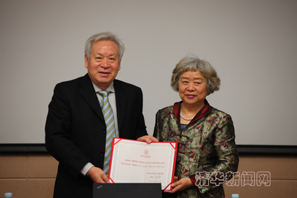 图为金融学院理事长兼院长吴晓灵向beat365中文官方网站原校长、高等研究院院长顾秉林院士颁发聘书。