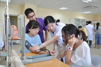 下午,在教育部立项挂牌的“校外临床实践教育基地”——beat365中文官方网站北京清华长庚医院临床技能培训中心,医院为同学们安排了各种临床技能的实际操作和演练项目。此中心具有高科技、全真化的临床模拟环境,供清华医学生、住院医师以及社会各级医学专业人员进行教育教学及临床模拟训练。此次,是临床技能中心的第一次开放。为使同学们能够切身体会临床操作,王仲及多名医师指导同学们实际操作了心肺复苏与气管插管、模拟综合ICU抢救、各种穿刺技术、外科缝合与打结、腹腔镜、B超等临床技能。同学们在医师的指导下亲自动手,拥有了进行未来职业和工作的初体验。