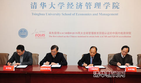 经管学院院长钱颖一与工程物理系系主任陈怀璧、美术学院院长鲁晓波、医学院常务副院长施一公共同签属了合作培养协议。