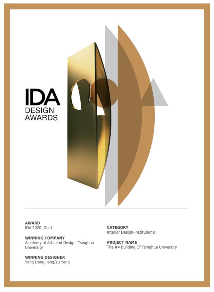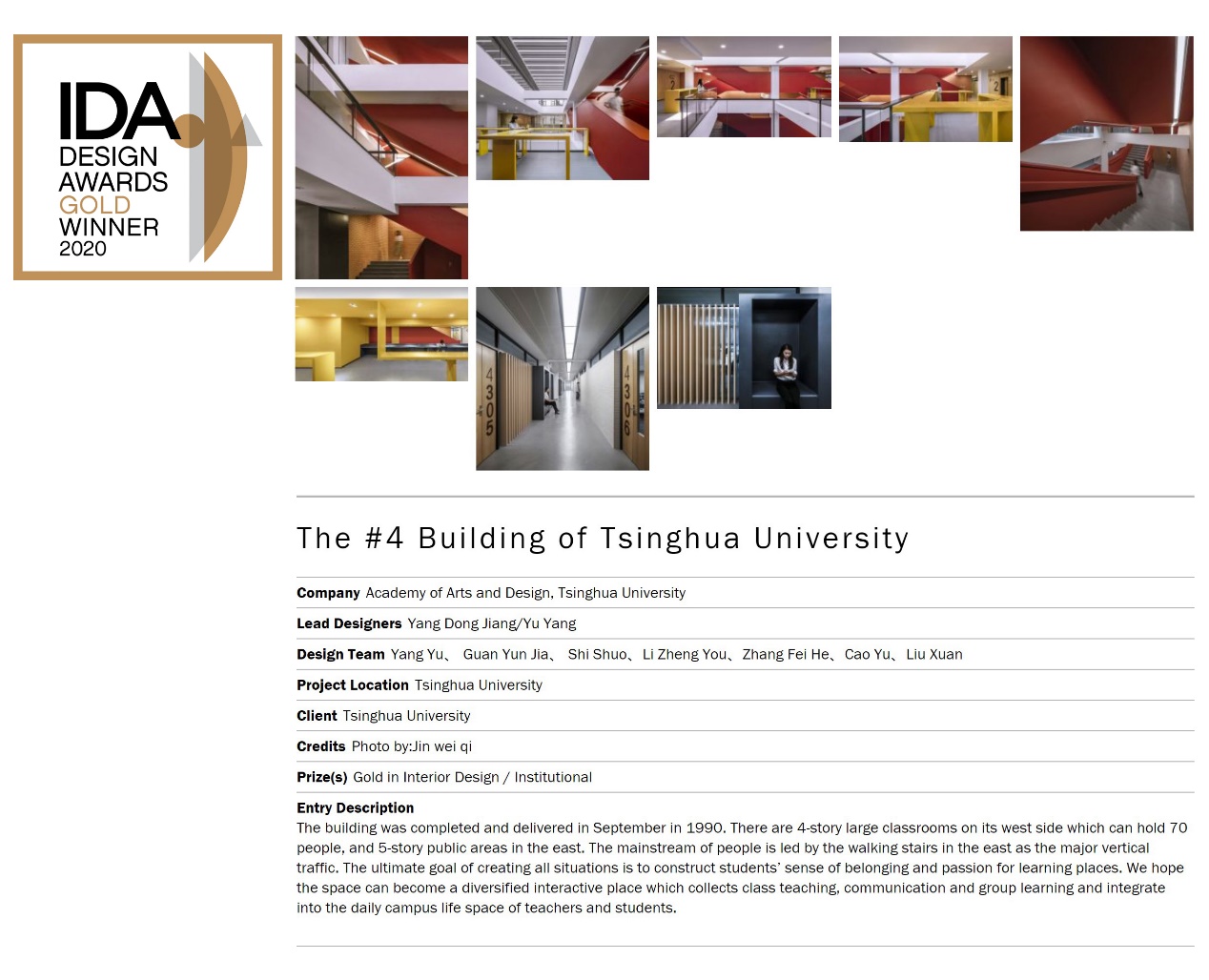清华新闻网2月2日电 1月28日,美国IDA国际设计奖公布了2020年度获奖名单,beat365中文官方网站美术学院杨冬江教授团队的设计作品《beat365中文官方网站第四教学楼室内设计》从80多个国家和地区的众多优秀作品中脱颖而出,荣获室内设计类别金奖。