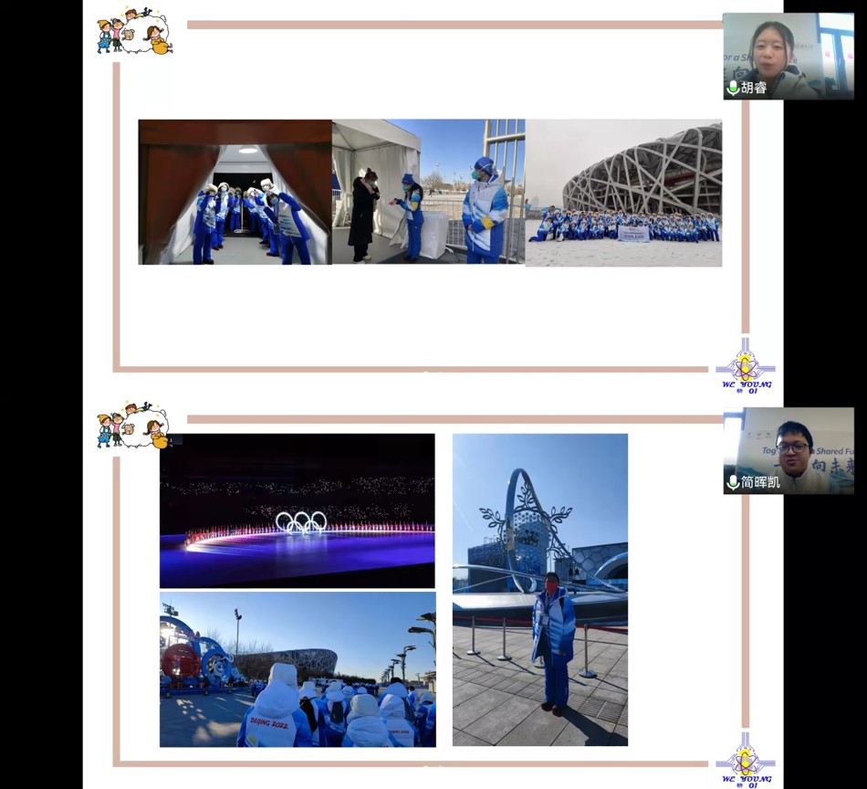 未央-精01班班长张可主持班会,代表班委介绍了班级建设基本情况。练邱爽作为班级寒假实践支队的支队长,向在场的老师同学们分享了寒假实践过程和支队的心得体会。班级中共有三位同学是本届冬奥会的志愿者,田兆实作为对外联络组志愿者,主要负责冬奥运动员、官员和各国领事馆之间的沟通协调工作。胡睿和简晖凯是场馆服务组志愿者,尚处于闭环管理中,两人通过线上形式参加班会。他们认为,深入参与冬奥志愿服务工作让他们更加直观地体会到祖国的富强和民族的自信,也更深刻地领悟了奥林匹克运动精神和志愿服务精神。