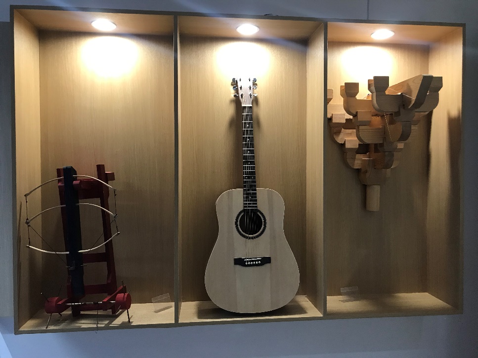 展览同时展示了学生在训练中心“制造工程体验”课程中手工制作的弩车、吉他和斗拱等作品,体现了人文艺术与工程实践之间的跨学科融合。