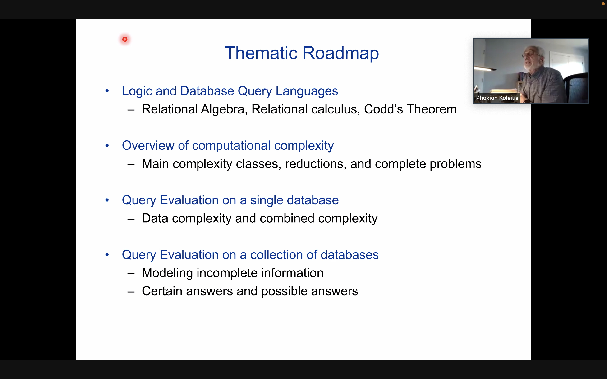 “逻辑、数据与不完全信息”课程由加利福尼亚大学圣克鲁兹分校和IBM研究实验室的克拉提斯教授(PhokionG.Kolaitis)讲授,他在数据库系统、计算机科学中的逻辑和计算复杂性理论等领域深耕多年,成果颇丰,是2020年阿隆佐·丘奇奖的获得者之一。在为期一周的课程中,他从基本的关系数据模型和用于数据库查询的逻辑语言出发,在介绍基本的计算复杂性理论之后,深入浅出地介绍了一系列关于数据库查询、映射、交换和整合的问题及其计算复杂性结果,以及许多该领域的前沿问题。
