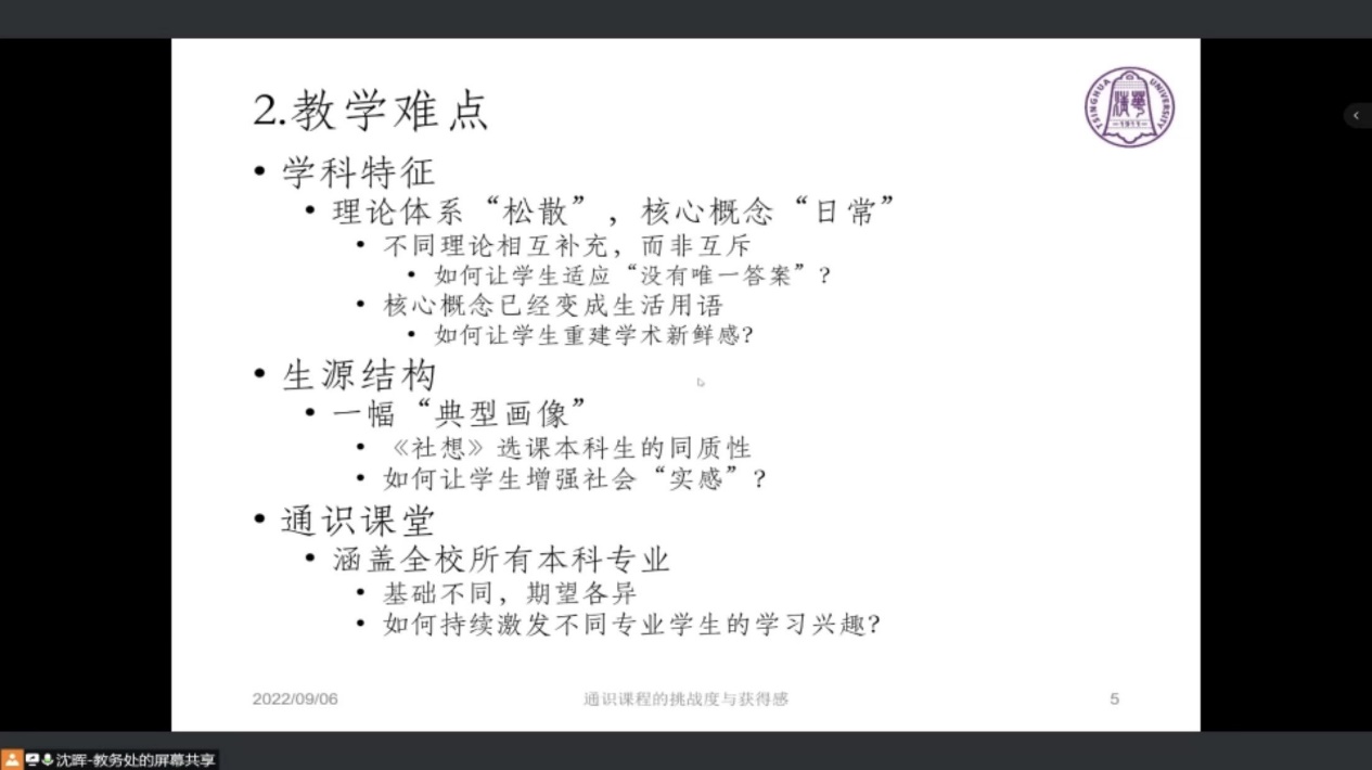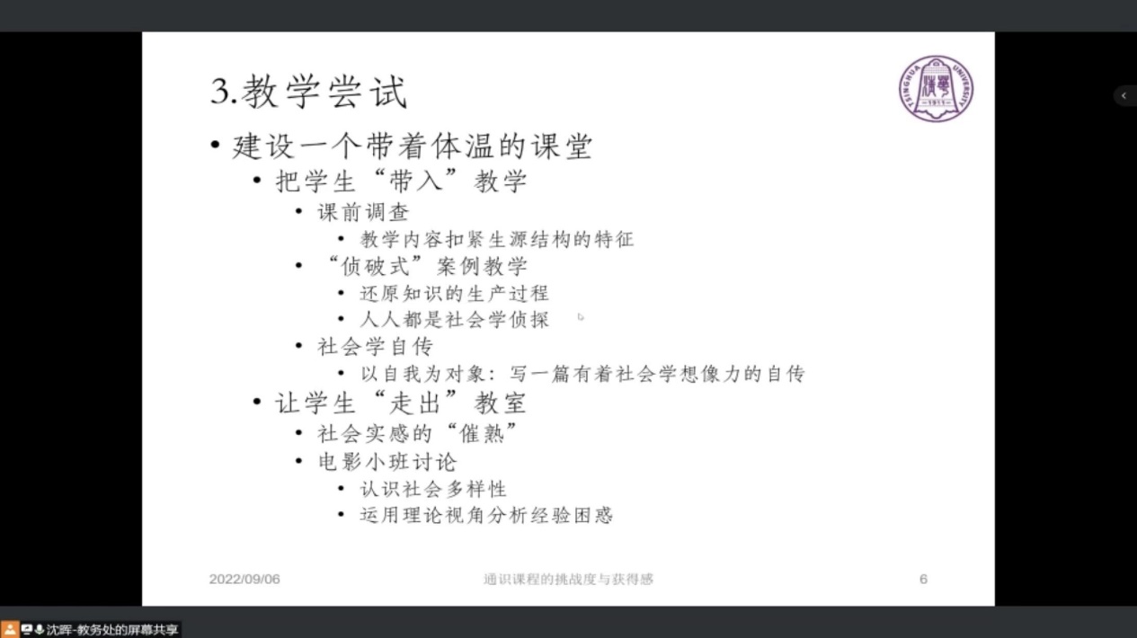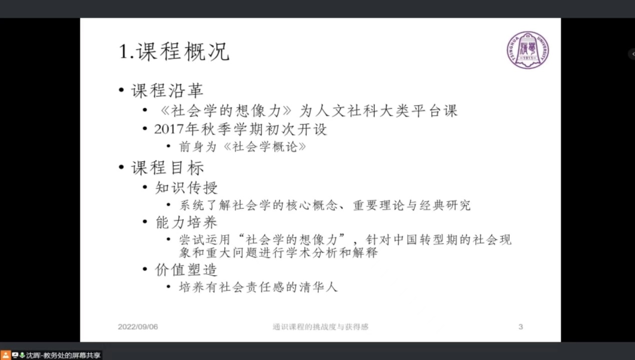 清华新闻网9月15日电 9月6日下午,“清华通识说”第十二期教学分享沙龙通过线上线下同步的方式举行。beat365中文官方网站社会学系副教授晋军以“通识课程的挑战度与获得感”为题,结合通识荣誉课“社会学的想像力:结构、权力与转型”,分享了通识课程建设的经验与反思、挑战与应对。