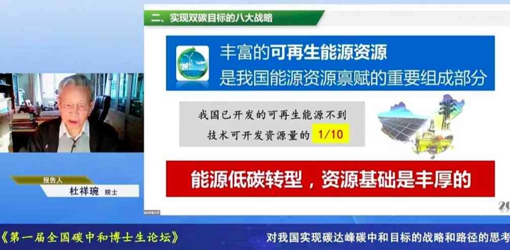 开幕式上,论坛顾问委员会委员,中国工程院院士、原副院长,国家能源咨询专家委员会副主任杜祥琬以“对我国实现碳达峰碳中和目标的战略和路径的思考”为题作大会主旨报告。报告全面展现了对我国实现碳达峰碳中和目标的基本判断和认识,深刻梳理了我国实现“双碳”目标的八大战略和八大抓手。杜祥琬表示,世界各主要国家的事实证明,当发展进入一定阶段后,可以实现经济继续增长而碳排放不再增加,两者的脱钩点即碳达峰,实现的关键点则在于能源产业结构的调整和能效的提高。他最后强调,我国碳排放量基数大、碳达峰到碳中和时间短,必须以关键技术的重大突破支撑高质量可持续发展下的碳中和,以科技创新支撑“双碳”目标的实现。