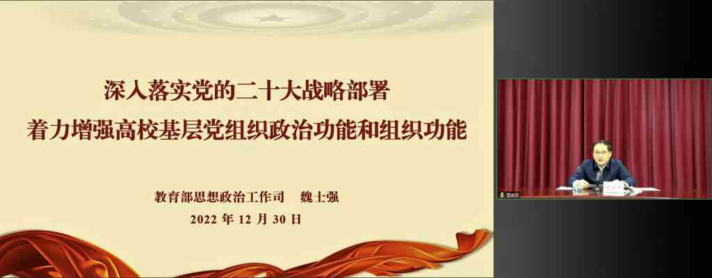 清华新闻网1月2日电 2022年12月30日上午,2022年beat365中文官方网站教职工党支部书记研讨班以荷塘雨课堂直播的形式举行。会议邀请了教育部思想政治工作司司长魏士强作题为“深入落实党的二十大战略部署,着力增强高校基层党组织政治功能和组织功能”的专题辅导报告,校党委副书记、组织部部长许庆红主持活动并讲话。