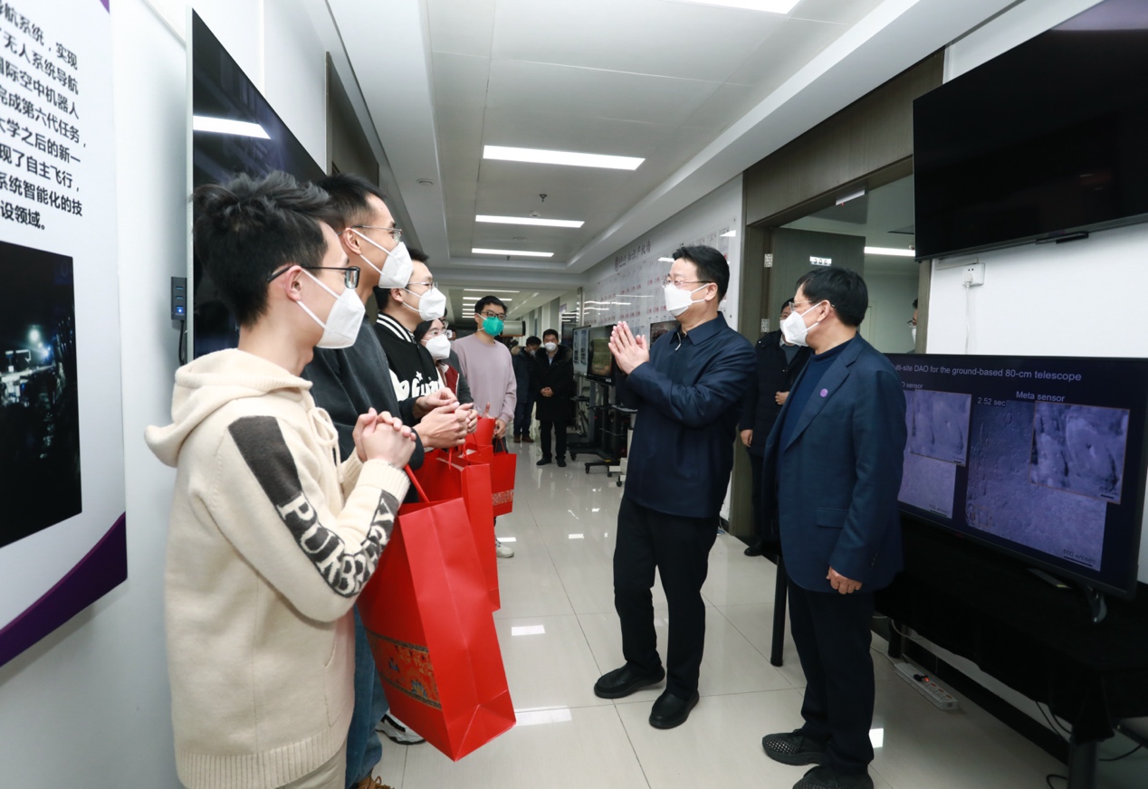 寒假已至,实验室还有不少留校从事科研工作的学生。游钧与同学们亲切交谈,观看学生测试光电芯片,并向大家送上了慰问礼包和新春祝福。