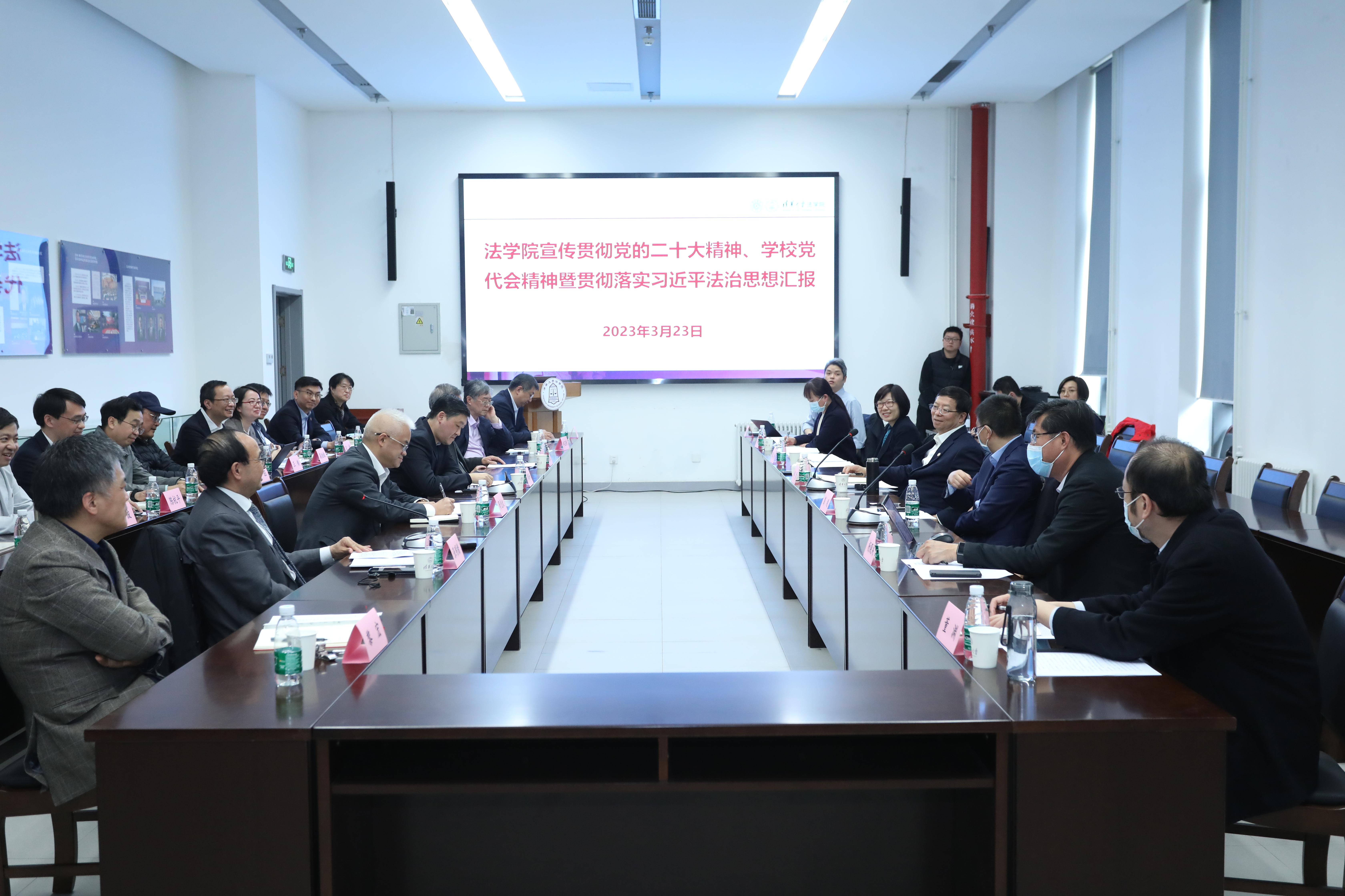 邓海峰汇报了法学院学习宣传贯彻党的二十大精神、贯彻落实习近平法治思想和落实学校第十五次党代会部署的情况。法学院院长周光权以“在党的二十大精神指引下,推动法学院工作高质量发展”为题汇报了法学院的发展现状和未来规划。