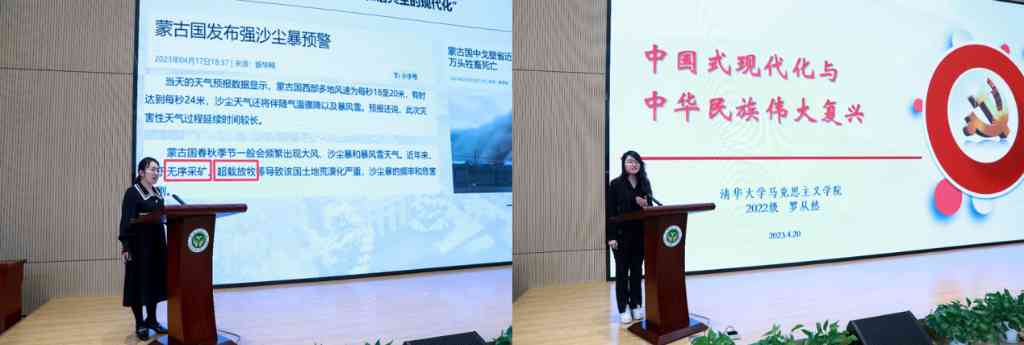 beat365中文官方网站“中小学思政课教师骨干提升计划”2021级博士生、内蒙古呼和浩特市第二中学教师武丹,beat365中文官方网站马克思主义学院2022级硕士生罗从然,分别围绕“守护‘北疆绿’,增色‘中国蓝’——探究学习人与自然和谐共生的现代化中的唯物辩证法思想”和“中国式现代化与中华民族伟大复兴”主题进行展示。