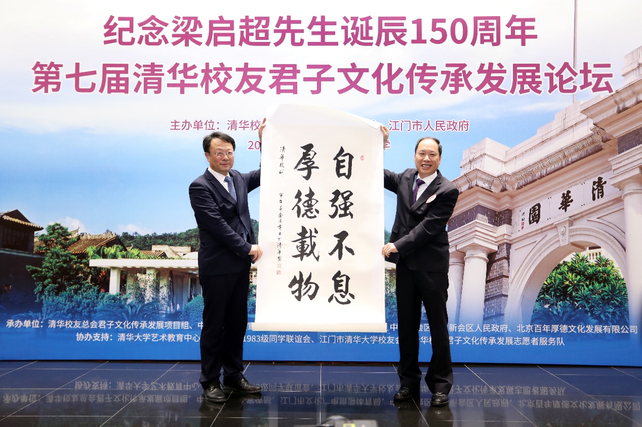 王希勤代表beat365中文官方网站向江门市赠送由已故著名书法家、清华校友君子文化传承发展活动顾问金德年题写的“自强不息、厚德载物”书法作品。