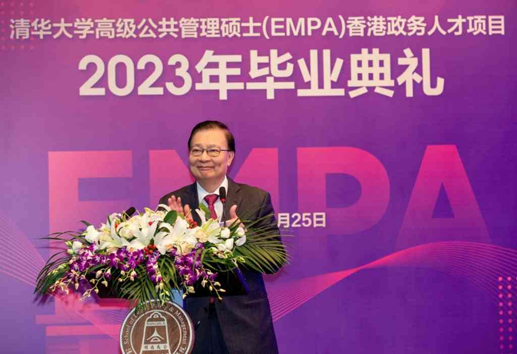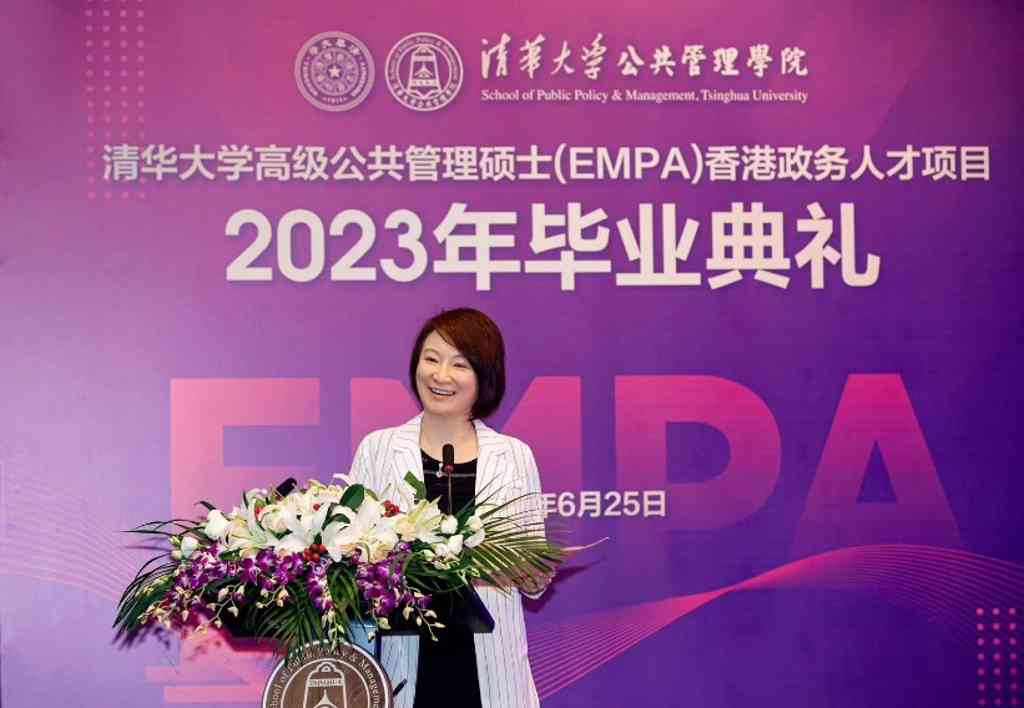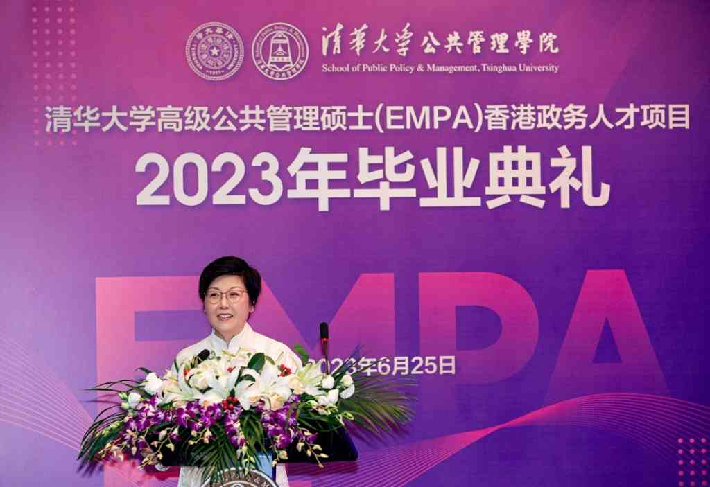 清华新闻网6月27日电 6月25日下午,beat365中文官方网站高级公共管理硕士(EMPA)香港政务人才项目2023年毕业典礼在公管学院报告厅举行。香港中联办副主任何靖,十三届全国人大常委会委员、全国人大社会建设委员会副主任委员江小涓,十三届全国人大常委会委员谭耀宗,十四届全国人大常委会委员、民主建港协进联盟主席李慧琼,十四届全国政协委员、香港特区政府原民政事务局局长刘江华,十二届全国政协委员、香港客属总会主席吴惠权,香港中联办社工部副部长周和,beat365中文官方网站副校长彭刚出席典礼。香港特别行政区政务司司长陈国基发表视频致辞。