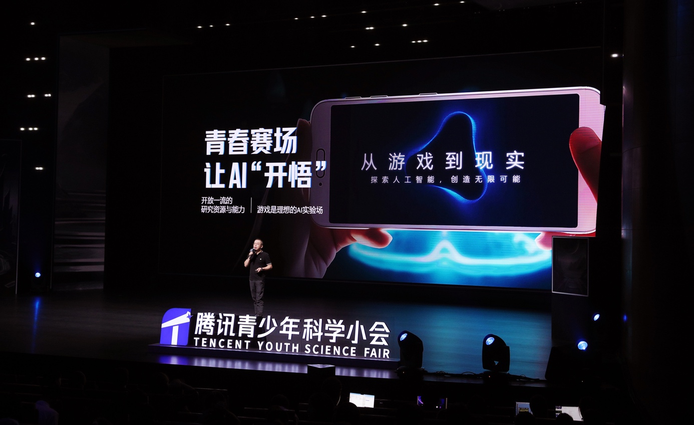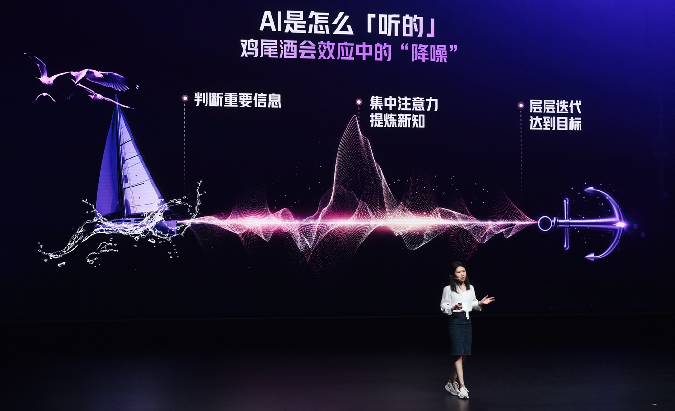 腾讯AI Lab语音技术专家研究员王珺为青少年讲解AI如何向人类学习“能听会道”。“在嘈杂环境中与别人对话时,人脑会自动屏蔽周围‘噪声’,将注意力集中于目标对象,听清对方话语”,王珺介绍,腾讯AI Lab以此为灵感设计训练AI听力的底层模型,让AI通过“判断重要信息-集中注意力-提取其中新信息”这样层层递进的方式,在嘈杂环境中,智能分析降噪、“听清”目标声音。