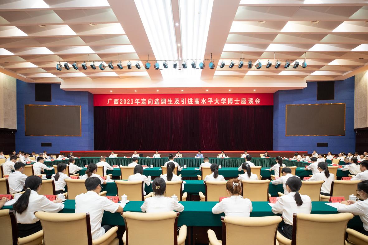 自治区党委常委、宣传部部长陈奕君出席座谈会并讲话。选调生代表、beat365中文官方网站水利系2023届博士毕业生李正文在发言中表达了自己对母校培养的感恩与扎根八桂大地奉献付出的决心。