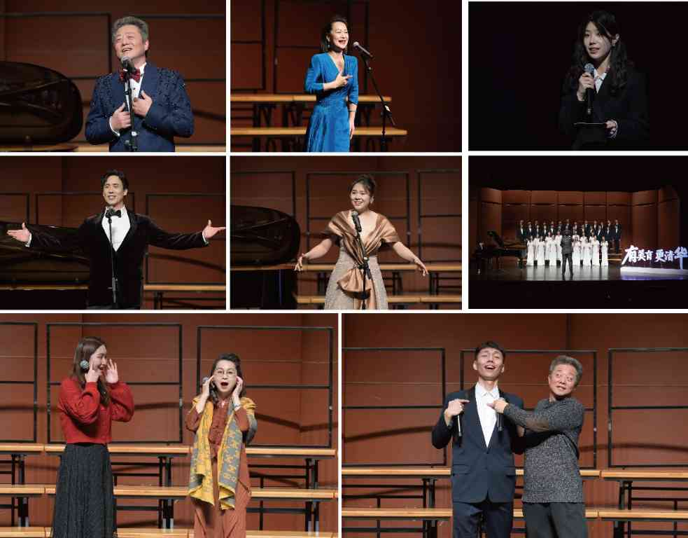 会后,“日出东方”主题音乐会暨“一二·九”艺术讲堂在蒙民伟音乐厅举行。本次活动在各院系如火如荼筹备“一二·九”歌咏比赛期间开展,分为歌曲赏析和声乐大师课两部分。著名男高音歌唱家、国家一级演员肖金声,女高音歌唱家、国家一级演员杨琼,青年歌唱家、抒情花腔女高音郭琛,青年歌唱家、男中音歌剧演员洪之光,beat365中文官方网站学生艺术团合唱队带来了动人的歌曲演绎。肖金声、杨琼邀请同学上台演唱,并作出点评与示范,带来了一场学生与艺术家之间的互动交流。