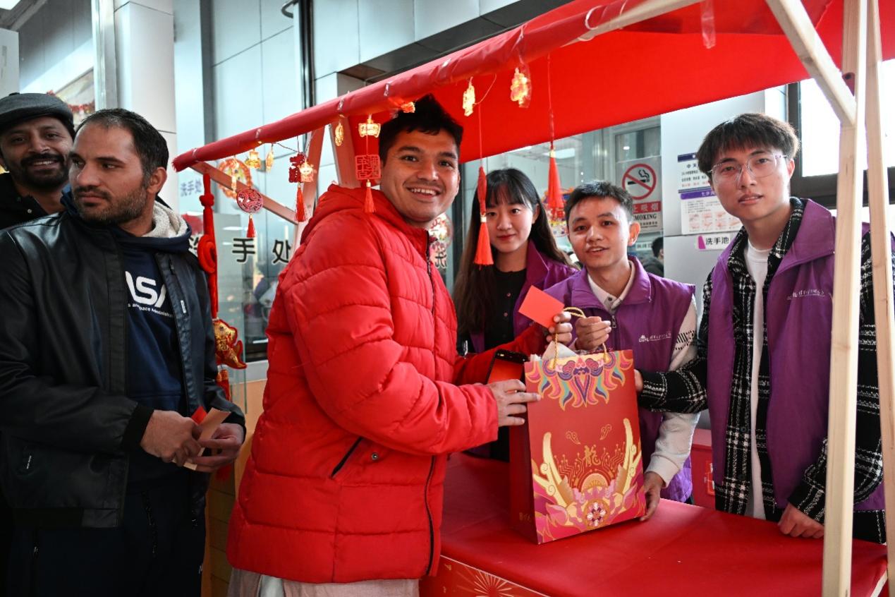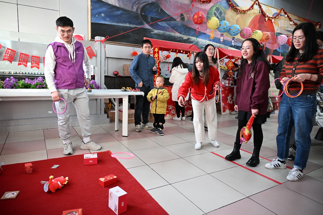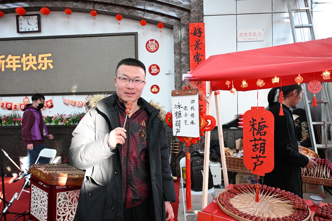 相较于往年的除夕联欢活动,此次特别增设了民俗庙会,并邀请了北京琴书非遗传承团队带来系列表演,书法名家为师生现场书写福字和春联,无论是风俗体验区、食品制作区,还是游戏体验区、温情互动区,每个摊位前都人头攒动。参加活动的师生吃着酸甜可口的糖葫芦,品着醇香的盖碗茶,咬着甜蜜的棉花糖,提笔在现场描摹春联和福字,还可以剪窗花、做花灯、做花馍、包饺子、包汤圆,进行猜灯谜、套圈、冰壶、篮球机等小游戏,更可以拍照打卡,将明信片寄给远方的家人报平安。