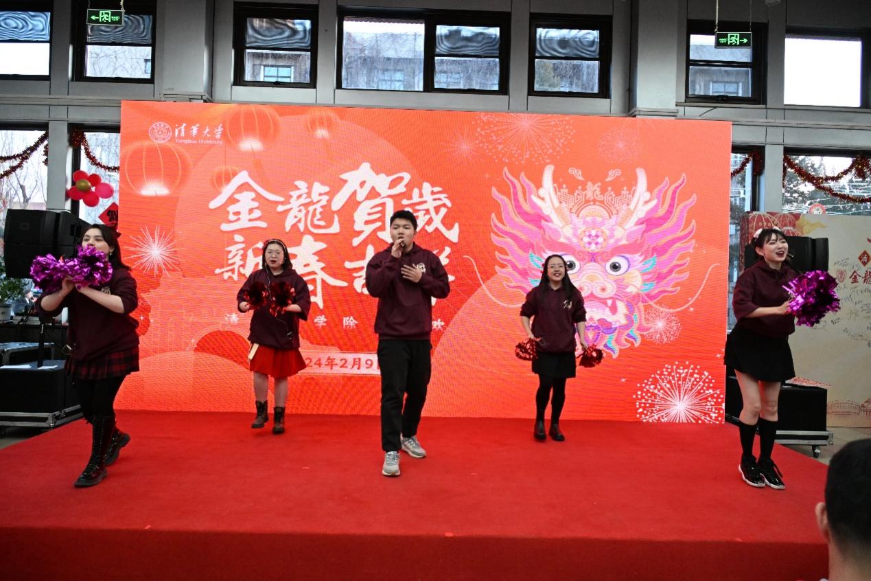 联欢活动现场诚意满满,匠心独具。现场布置了美院王红卫教授团队设计的龙年形象“清华龙”装饰,入口和大厅里张贴了以“清华”为藏头的春联。活动现场还为每一位到场的师生员工准备了福袋,包括有拉花、灯笼、DIY贴画等,还有带有祝福语的水果盲盒,可谓惊喜连连。