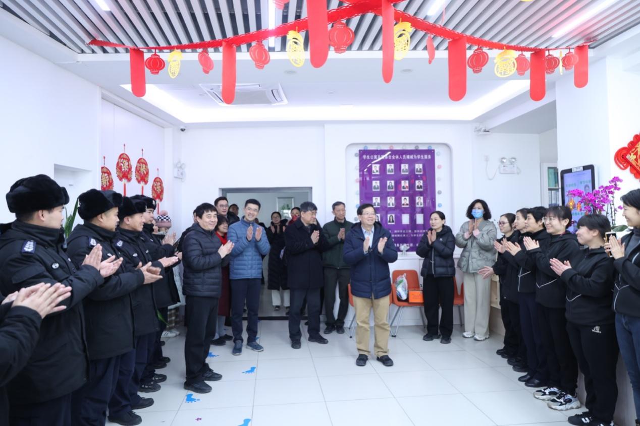 在甲所,李路明与值守人员亲切交流,仔细了解他们春节期间的工作安排和生活情况,并代表学校向大家拜年。在西门,李路明看望慰问值守的安保人员,感谢他们为守护校园安全所作出的贡献,并送上新春的祝福。