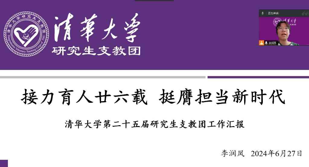 第二十五届研究生支教团团长、人文学院2019级本科生李润凤在线上代表全团汇报了一年支教服务工作的整体情况。过去一年,第二十五届研究生支教团扎根祖国基层,服务于青海、西藏、湖南、陕西、云南、河北六地七校,以教书育人为核心,以党建引领、公益帮扶、团学工作为基础,圆满完成了为期一年的服务工作。除教学任务外,志愿者们还通过指导社团协会、开展艺术活动等团学工作将育人工作融入学生日常生活。同时,依托研究生支教团功能型党支部与当地学校的党支部深入开展联学共建,为更好服务国家需求提供支撑。