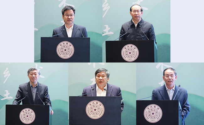 郭玮、王乐君、李稻葵、杜志雄、高其才作主旨演讲(从左至右、从上至下)