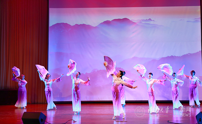 在终身教育处的开场舞《舞动中国》的喜庆旋律中,晚会拉开了帷幕。演员们携着鲜艳的绸扇翩然起舞,欢乐的氛围点亮整个大礼堂。