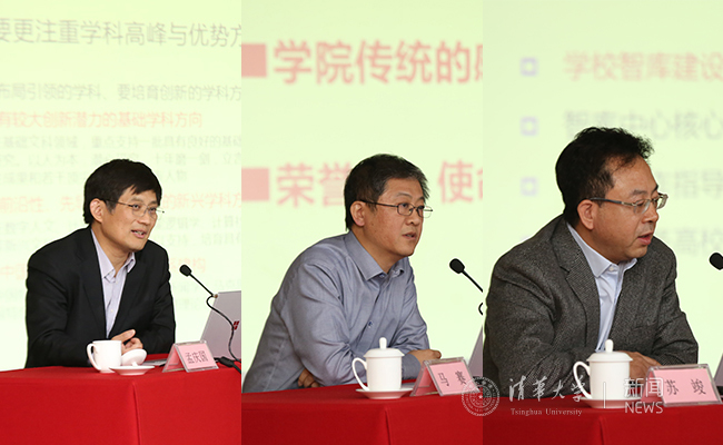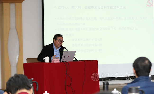 文科建设处处长孟庆国介绍了深入推进文科建设“双高”计划的成效与下一步举措;美术学院党委书记马赛以清华美院师生参与国庆庆典广场景观与彩车设计任务为案例,阐述了对思想政治工作与专业实践相结合的理解;智库中心主任苏竣就“建设一流智库中心,服务国家重大战略决策”作了专题报告。