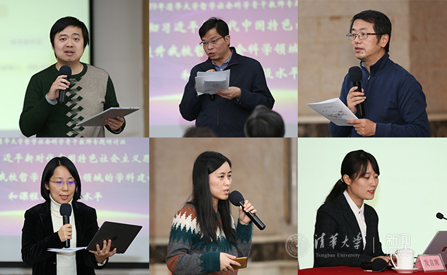 法学院副教授龙俊、人文学院副教授蔡文鹏、教务处副处长王巍、外文系副教授张叶鸿、人文学院助理教授袁先欣、马克思主义学院助理教授邓喆(从左到右、从上到下)分别代表各自小组作交流发言