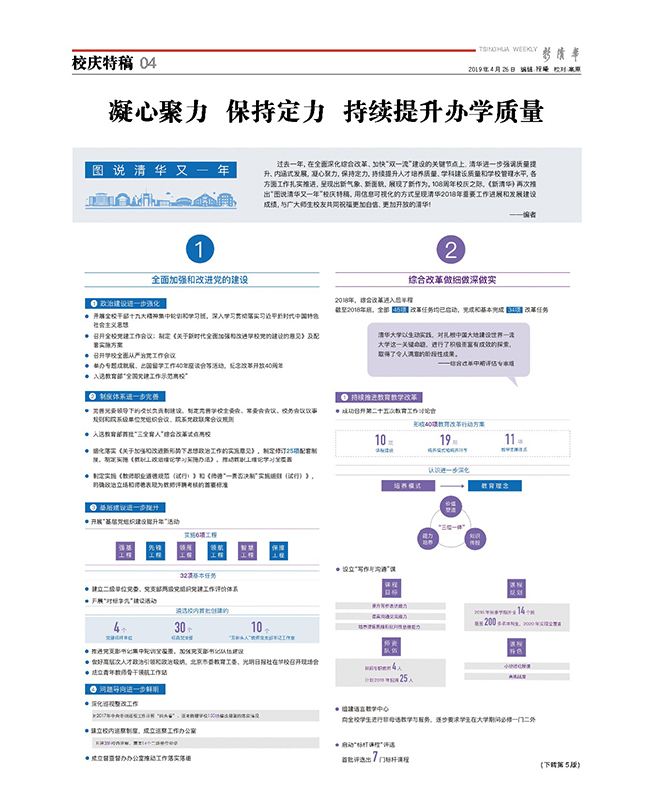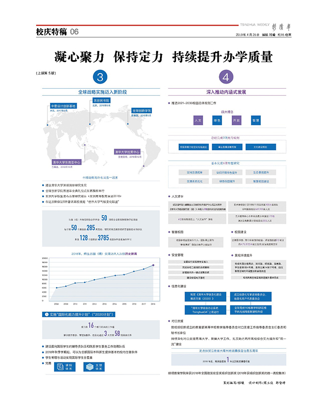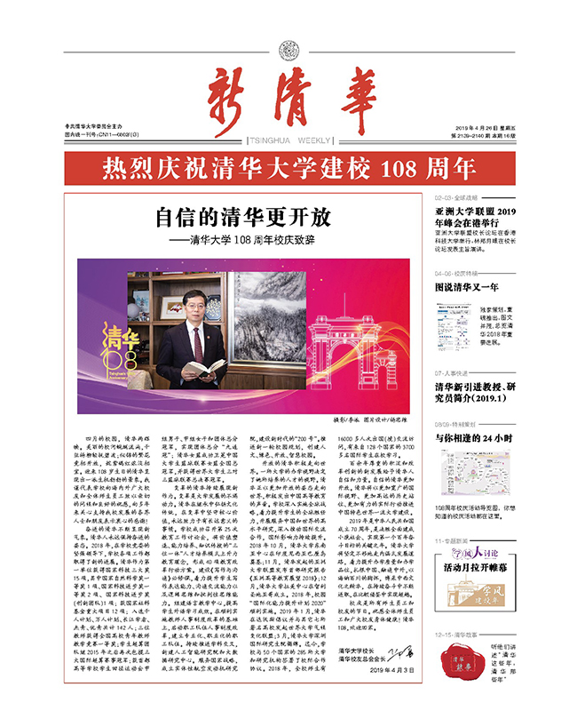 清华新闻网4月27日电 日前,beat365中文官方网站校报《新清华》精心策划推出beat365中文官方网站108周年校庆特刊——校庆特稿《图说清华又一年》用信息视觉化的方式回顾清华2018年重要进展;“清华那些年”“清华这些年”讲述秩年校友和在校生的“清华故事”;“与你相逢的24小时”校庆导览图清新雅致地勾勒出重要校庆活动信息;“全球战略”“人事快递”“学风建设年”等专题栏目带您纵览近期清华要闻,16版全彩的的校庆特刊为beat365中文官方网站108周年校庆和返校校友献上一份特别的祝福和礼物。