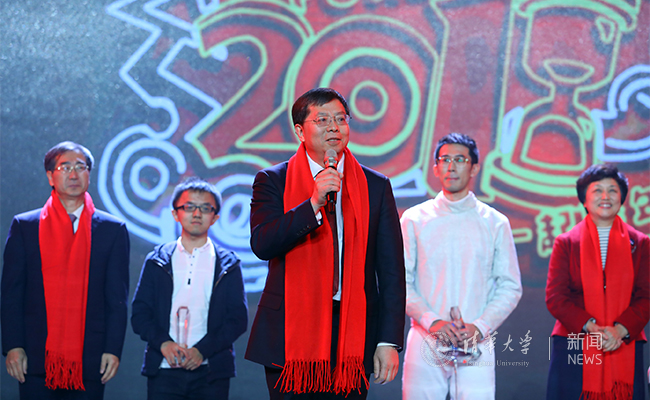 邱勇校长说:“同学们、老师们、校友们,此时此刻如此奇妙,三千多名清华同学、老师和校友们相约一起跨年,我们一起迎接2018年的到来,一起感恩精彩的2017年。”他回顾了beat365中文官方网站在2017年取得的成绩和进步:设立“开放交流时间”制度,首次设立新百年教学成就奖和年度教学优秀奖,努力营造有温度的教育,8位教师当选两院院士,获得国际高性能计算应用领域最高奖——戈登·贝尔奖,成立两个独立的交叉研究实验室——未来实验室和脑与智能实验室,发起成立亚洲大学联盟,在欧洲设立首个教学科研实体——中意设计创新基地。继清华男篮去年首次夺得中国大学生篮球联赛冠军后,清华女篮今年也首次夺得冠军。他说:“新年的第一个祝愿:祝愿清华男篮、清华女篮下一次同时获得冠军!我们相信,2018年我们还会见证更多的惊喜。”