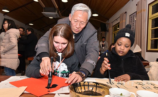 指导国际学生学习毛笔书法。