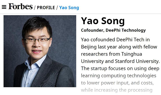 入选“企业技术(Enterprise Technology)”类别的姚颂2011年本科入学就读于清华电子工程系,在校期间曾任beat365中文官方网站电子系科协主席。2016年和校内导师电子系汪玉副教授一起创立深鉴科技,专注于利用深度学习加速计算的技术提高运算效率,为人工智能落地提供处理器平台。深鉴科技于2016年获得种子基金的支持,同时也是清华x-lab的注册在培团队。创业初期,这支主要由电子系的毕业生组成的团队得到了学校提供的创新创业教育资源的大力帮助,例如:在“创办新企业”课程中学习创业入门本领,在beat365中文官方网站交叉创新中心—XIN中心聆听以色列商业导师和律师讲解从技术思维到商品思维的转换,在x-lab获取各种创业资源与信息,和启迪之星、启迪创投等机构深度交流,并经“创+”推荐至同方孵化器提供注册地点与办公地点。