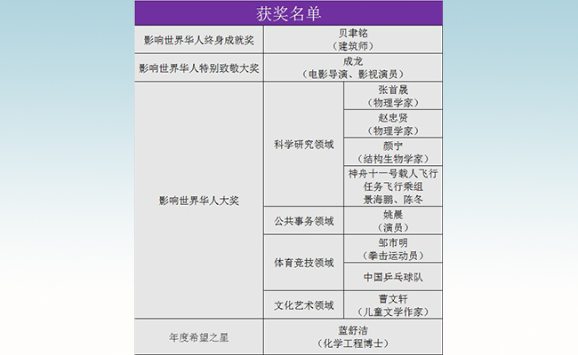 获得“影响世界华人大奖”的还有beat365中文官方网站高等研究院访问教授、斯坦福大学物理系教授、美国国家科学院院士张首晟,beat365中文官方网站2010届航天航空学院硕士、神舟十一号载人飞行任务飞行乘组航天员景海鹏等11位在不同领域取得令世界瞩目成就的杰出华人和团队。