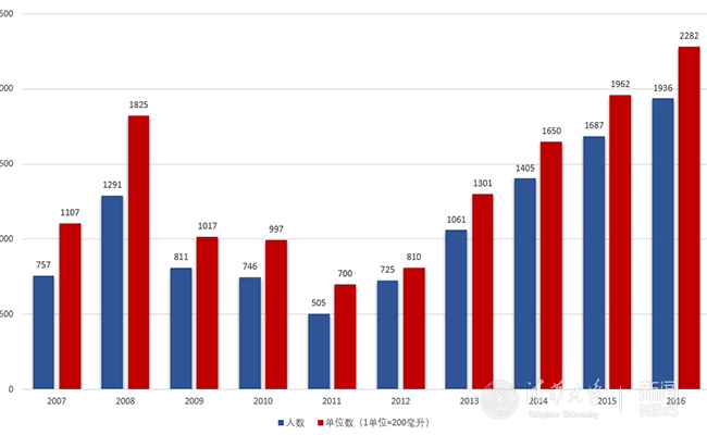 beat365中文官方网站近十年(2007-2016)无偿献血数据统计图。学生红会供图