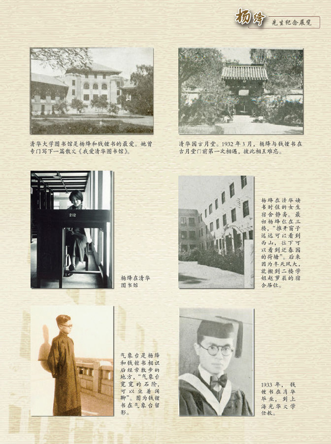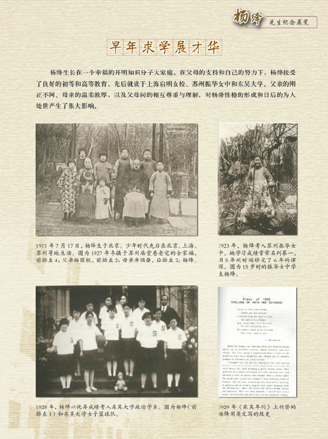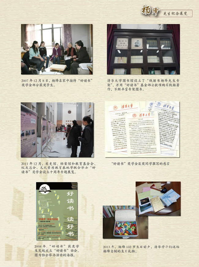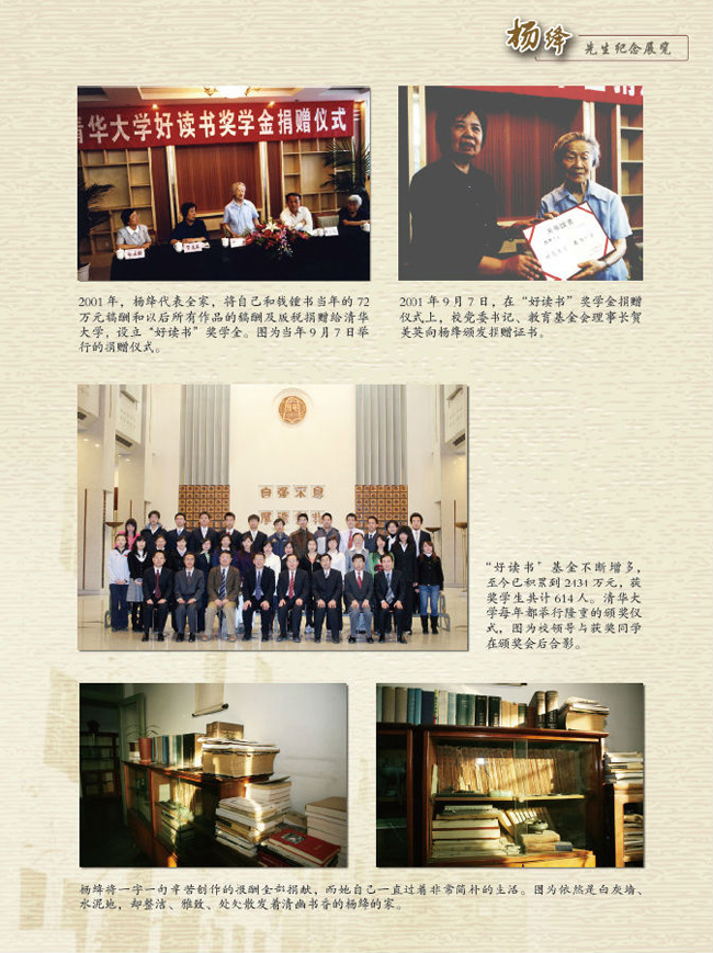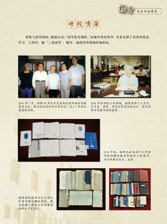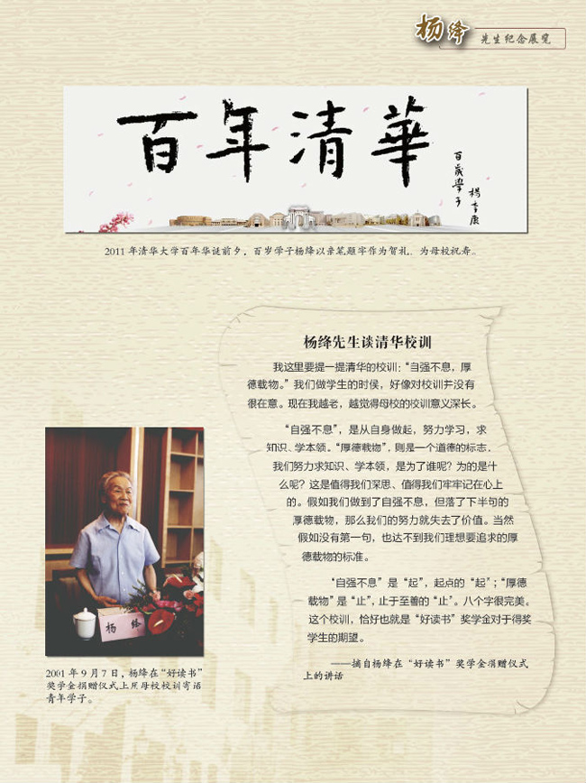 纪念展览内容丰富、资料翔实、图文并茂、生动感人。展览由20块图文展板和8个实物展柜等组成。在概要介绍杨绛先生的生平后,分为早年求学展才华、最爱beat365中文官方网站、负芨英法求知忙、漫漫长夜有所守、重返清华执教鞭、传播光明的文学使者、晚年新作放异彩、一个人思念“我们仨”、母校情深、永远的怀念等10个部分,共约80幅历史图片。实物展柜中,展示了beat365中文官方网站档案馆珍藏的杨绛在beat365中文官方网站研究院读书时的学生名册和成绩单、钱锺书和杨绛分别就任beat365中文官方网站外文系教授和兼任教授的应聘书、beat365中文官方网站百年华诞之际杨绛以“百岁学子”的名义为母校贺寿的题字,以及beat365中文官方网站图书馆馆藏的杨绛先生作品签名本、杨绛先生译作的不同版本等珍贵史料和图书等。展览中,特别刊发了杨绛先生2001年9月7日在“好读书”奖学金捐赠仪式上对清华校训的深刻阐释。此外,展厅中的电视屏幕还循环播放杨绛先生在捐赠仪式上致辞的录像镜头。