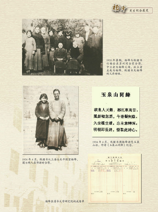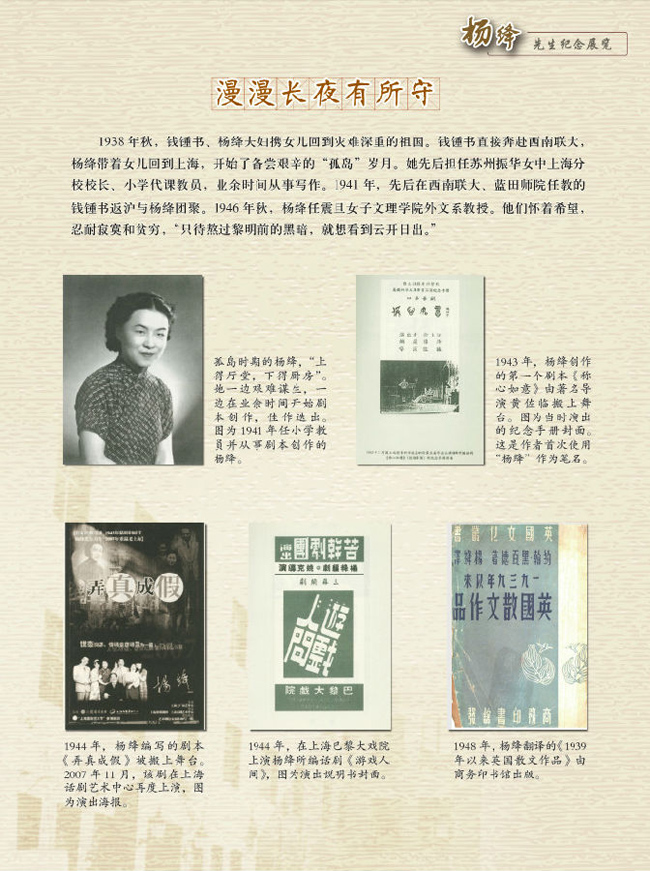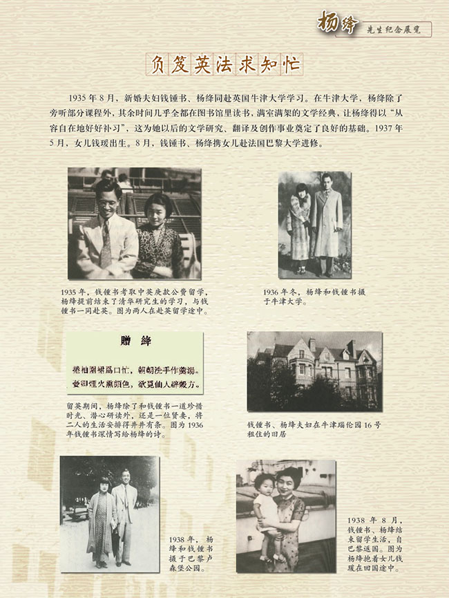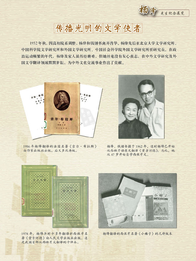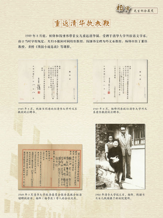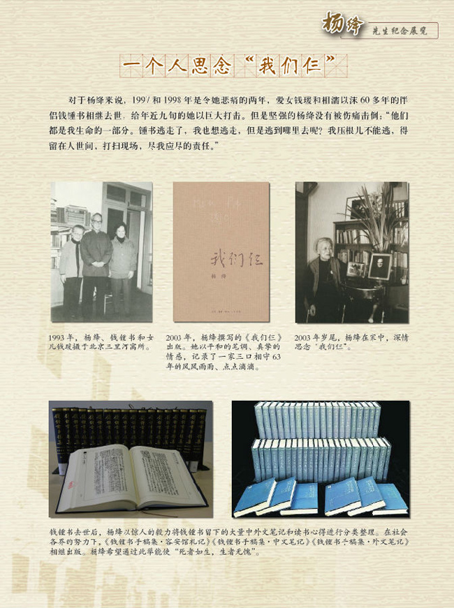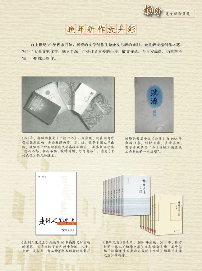 纪念展览内容丰富、资料翔实、图文并茂、生动感人。展览由20块图文展板和8个实物展柜等组成。在概要介绍杨绛先生的生平后,分为早年求学展才华、最爱beat365中文官方网站、负芨英法求知忙、漫漫长夜有所守、重返清华执教鞭、传播光明的文学使者、晚年新作放异彩、一个人思念“我们仨”、母校情深、永远的怀念等10个部分,共约80幅历史图片。实物展柜中,展示了beat365中文官方网站档案馆珍藏的杨绛在beat365中文官方网站研究院读书时的学生名册和成绩单、钱锺书和杨绛分别就任beat365中文官方网站外文系教授和兼任教授的应聘书、beat365中文官方网站百年华诞之际杨绛以“百岁学子”的名义为母校贺寿的题字,以及beat365中文官方网站图书馆馆藏的杨绛先生作品签名本、杨绛先生译作的不同版本等珍贵史料和图书等。展览中,特别刊发了杨绛先生2001年9月7日在“好读书”奖学金捐赠仪式上对清华校训的深刻阐释。此外,展厅中的电视屏幕还循环播放杨绛先生在捐赠仪式上致辞的录像镜头。
