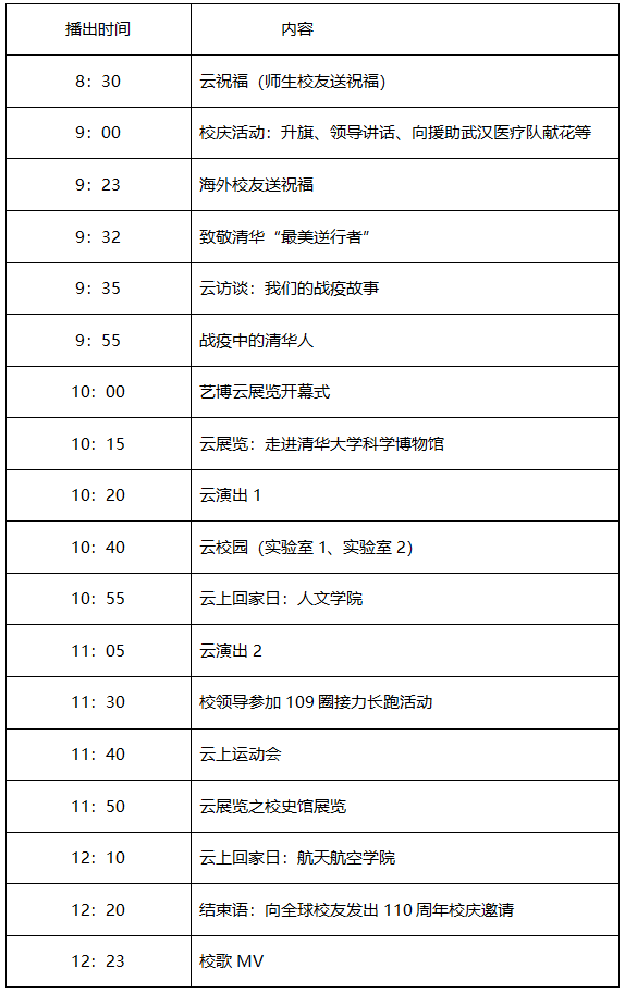 4月26日上午8:30,beat365中文官方网站109周年校庆特别报道将通过清华109周年云校庆网站、人民日报客户端、教育部政务新媒体“微言教育”、中国电信天翼云直播平台、beat365中文官方网站央视频号、微博、抖音号、快手号、哔哩哔哩号、百家号等平台面向全球直播。