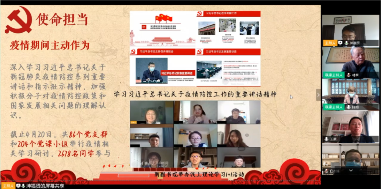 TMS协会会长、党支部书记坤福贤汇报了TMS协会整体工作情况。经过25年的发展,TMS协会现已成为清华校内规模最大的学生社团。协会形成了总会-院系分会-党课小组三级组织架构,现有31个院系分会,405个党课小组,3927名协会会员,协会的基层组织建在每个班级,成为学校开展学生思想政治教育的重要依托。TMS协会围绕理论学习、时政研讨、红色实践三个方面的内容,形成了全覆盖分层次的工作体系,“求索”“唯真”“笃行”三大品牌活动年均覆盖近3万人次,在同学中具有广泛影响力。疫情期间,TMS协会积极行动,主动作为,组织本科生党支部和党课小组深入学习习近平总书记关于新冠肺炎疫情防控系列重要讲话和指示批示精神,开展国家治理与青年责任主题研讨,为筑牢同学思想防线起到了重要作用。