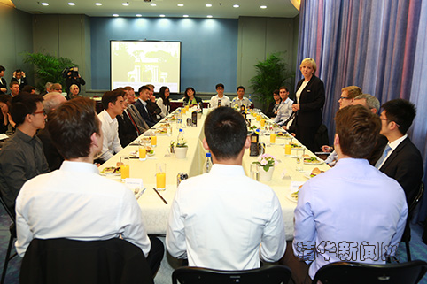 克拉夫特女士与清华-亚琛工业大学双学位硕士联合培养项目中、德同学共进午餐。记者 苑 洁 摄